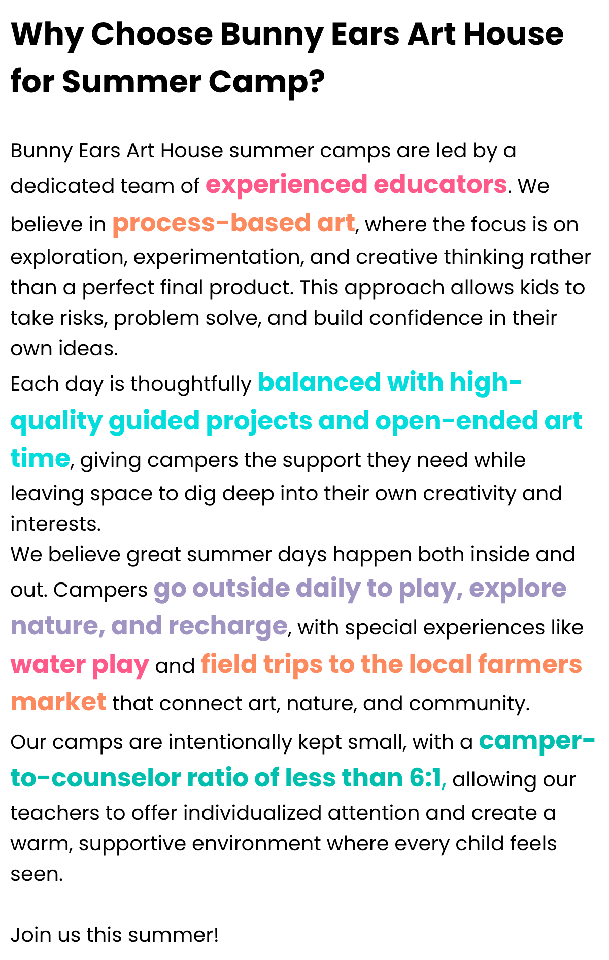 Camp is for ages 5-13! Although the age range is broad, it works well because our process-focused approach allows every child to engage in a way that feels right for them, with plenty of individual attention from our educators.